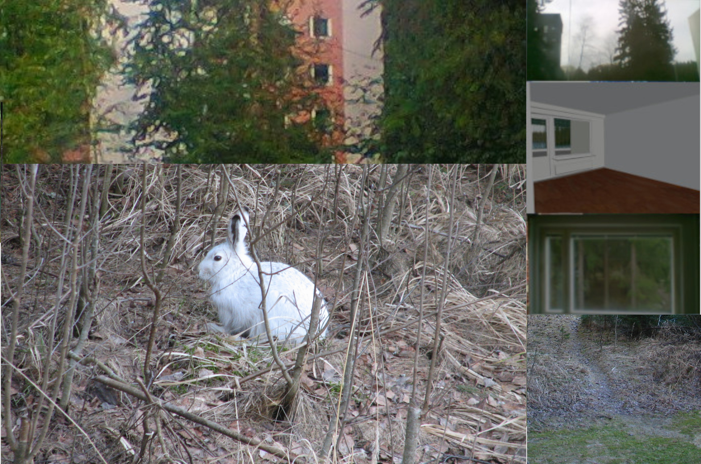 Piha: Edusta ja liittymä päällystetty, nurmi, jossa puita kadun puolella, keinupenkit, lasten keinu, hiekkalaatikko, iso kivi, polkupyörävaraston ulko-osasto jätekatoksen kanssa, naapuritalon pelastustie multa-soralla, kivetty polku metsään